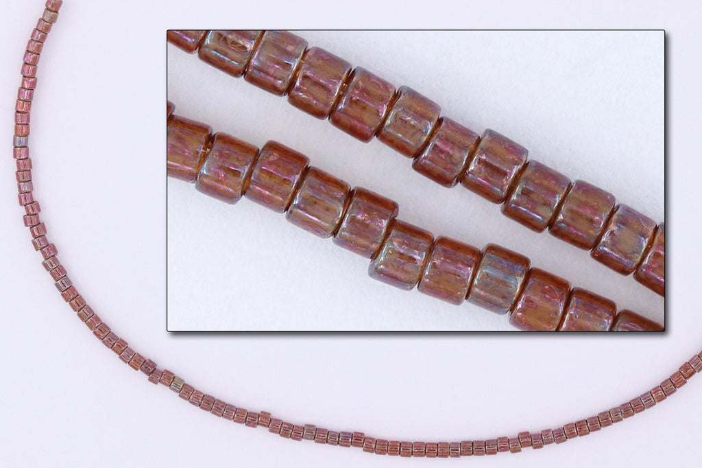 Size 11/0 pink luster topaz cylinder seed bead.