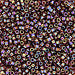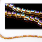 Size 11/0 transparent iridescent amber cylinder seed bead.