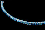Size 11/0 transparent iridescent sky blue cylinder seed bead.
