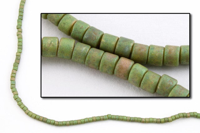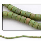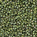 Size 11/0 matte metallic light yellow green cylinder seed bead.