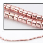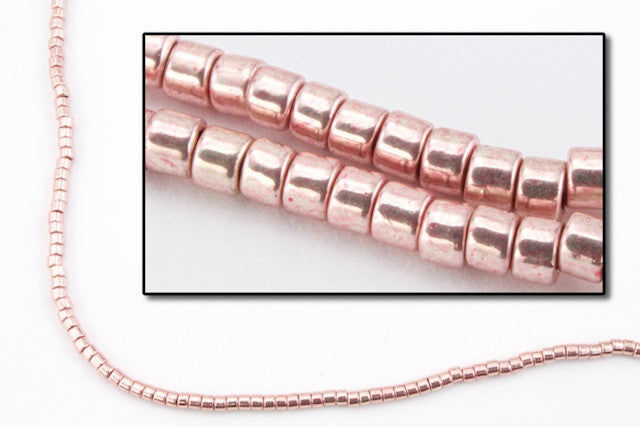 Size 11/0 galvanized light rose cylinder seed bead.