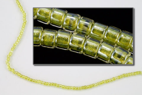 Size 11/0 shimmering light green gold lined crystal cylinder seed bead.