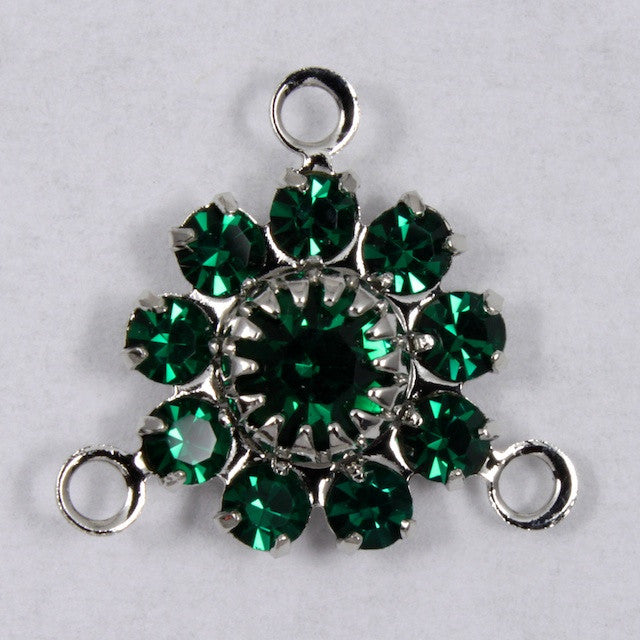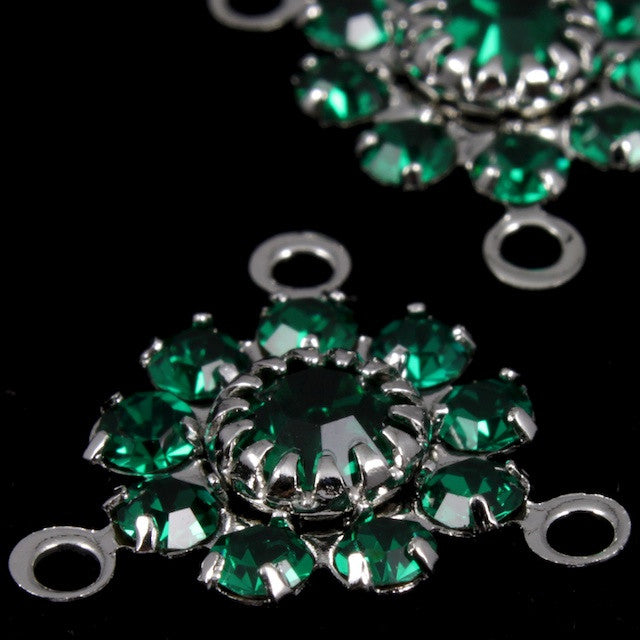 Emerald Swarovski point back rhinestones sparkle in silver settings.