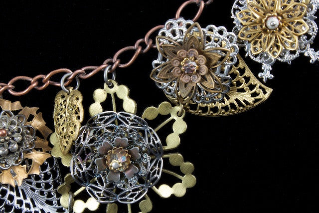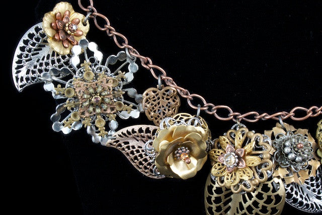 Handmade one of a kind necklace.Metal flowers are assembled from brass, copper,steel and pewter filigrees and beadcaps.Components are both vintage and modern.Metal flowers and leaves are attached to antique copper color chain ending with a brass dragonfly. The length is 19 inches.