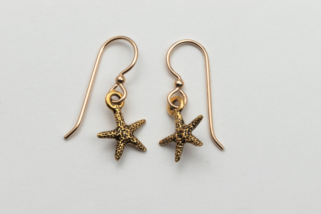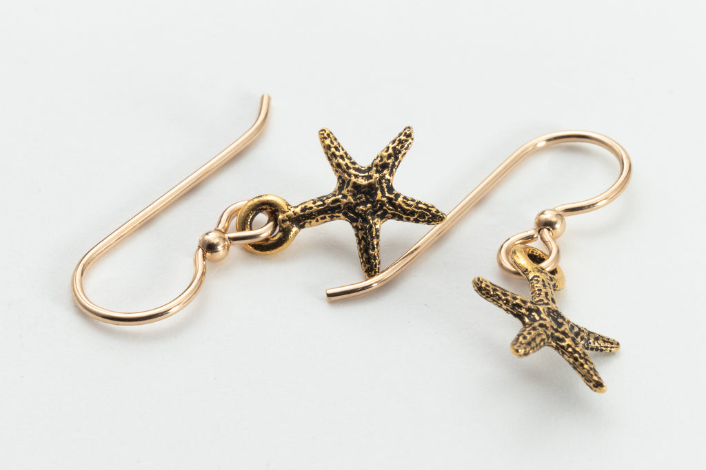 14 karat gold filled French style ear wires hold 10mm sea star/starfish charms molded from a real sea star.