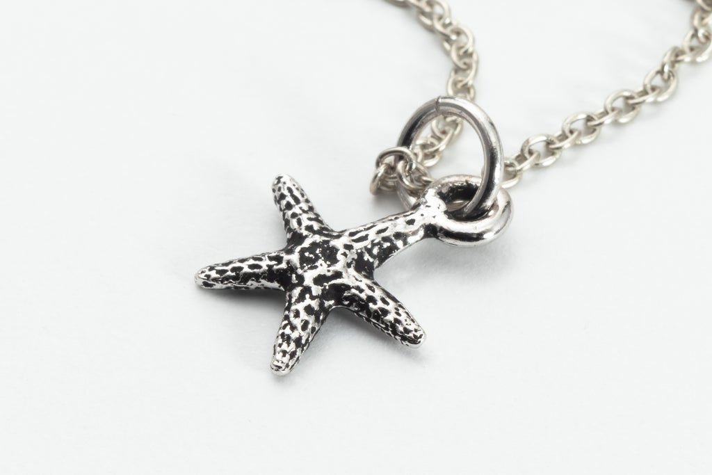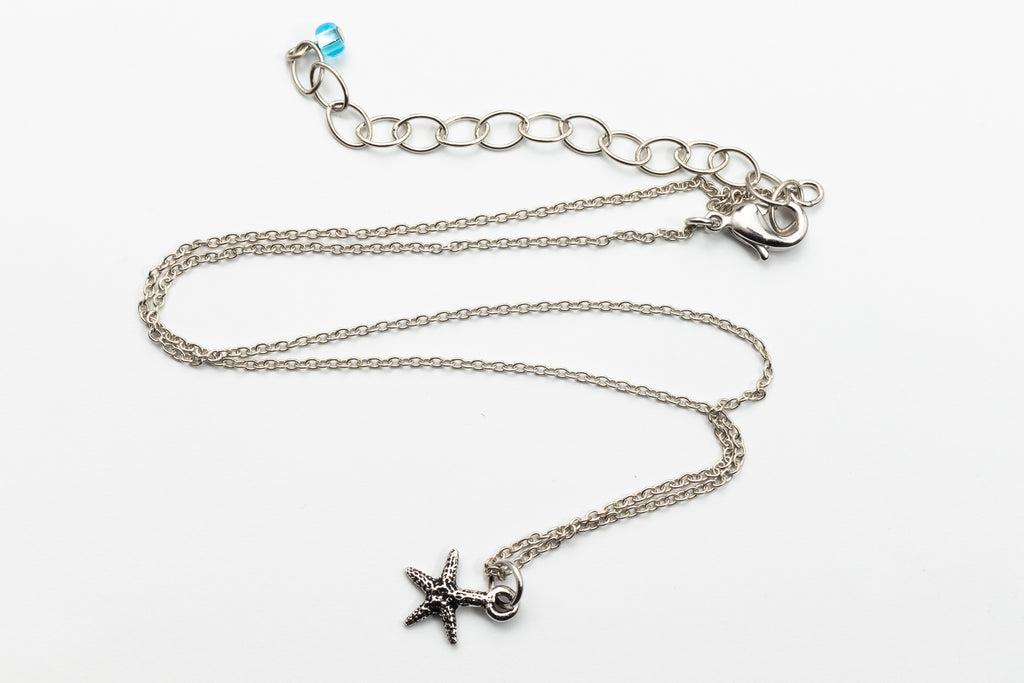 Delicate silver tone chain holds a 10mm sea star/starfish charm molded from a real sea star.