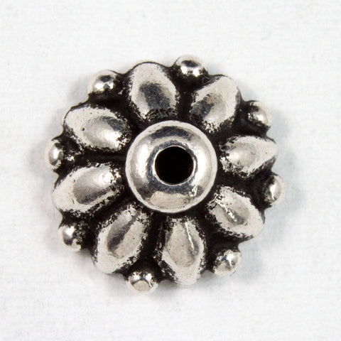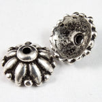 Current manufacture. 10mm antique silver bead cap with dharma border.