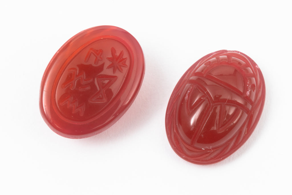 10.38mm x 14.27mm Egyptian Revival style carnelian scarab with hieroglyphs on the back.