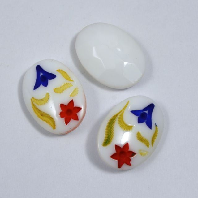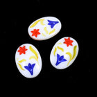 13mm x 18mm opaque white oval flat back with etched blue and red flower.