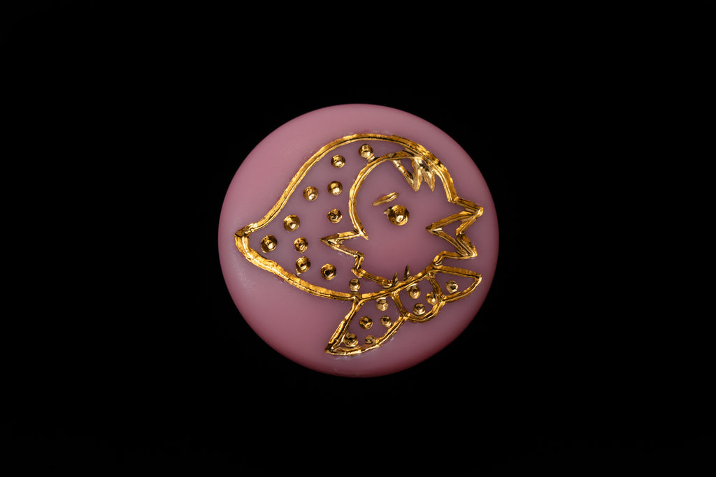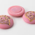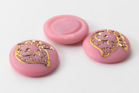 13.6mm pink low dome round flat back with gold outline of a chick.