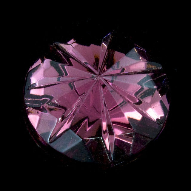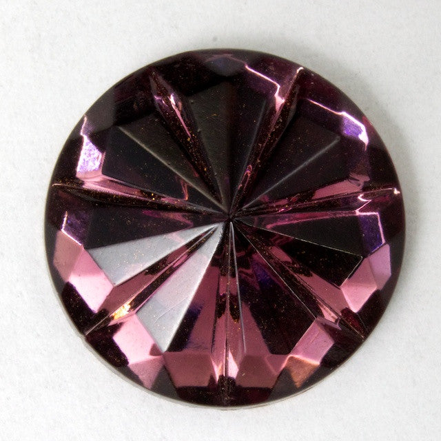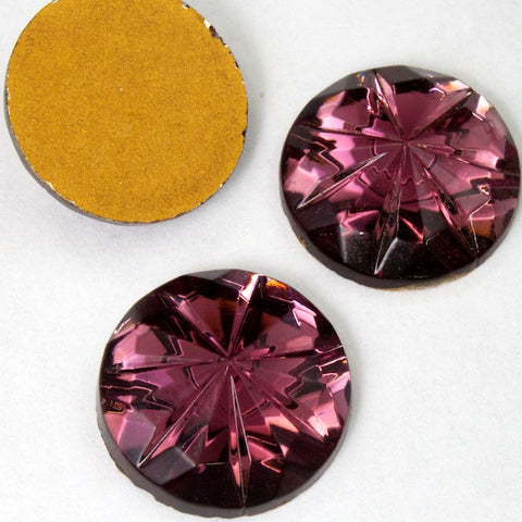 Vintage glass cabochon.15mm round flat back with seven radiating faceted sections.Amethyst with gold foiled back.Made in Germany circa 1960's. Sold individually.