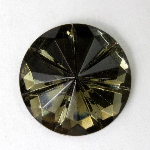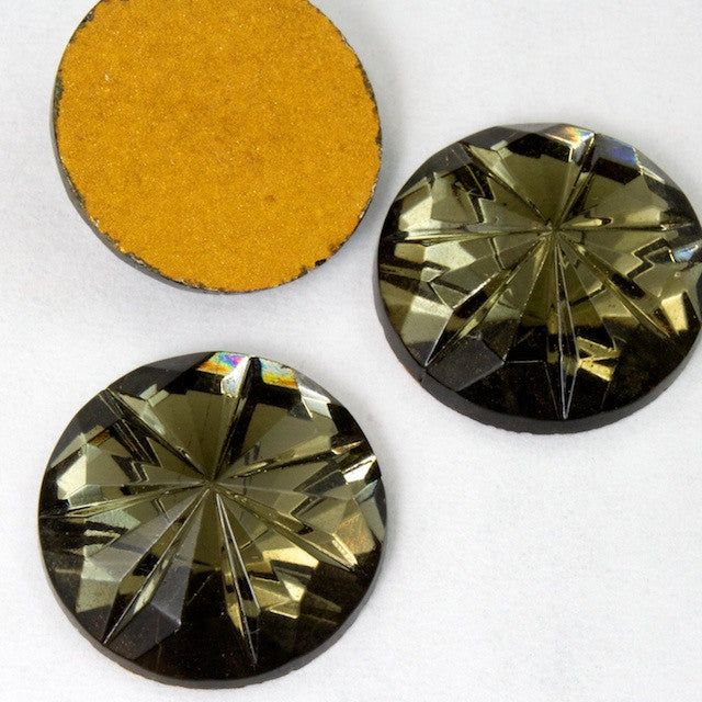 Vintage glass cabochon.15mm round flat back with seven radiating faceted sections.Black Diamond with gold foiled back.Made in Germany circa 1960's. Sold individually.