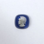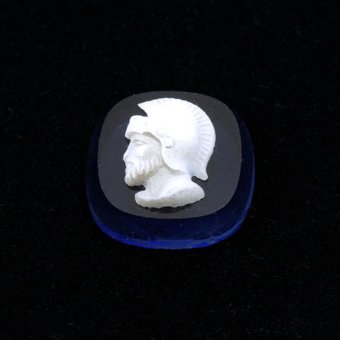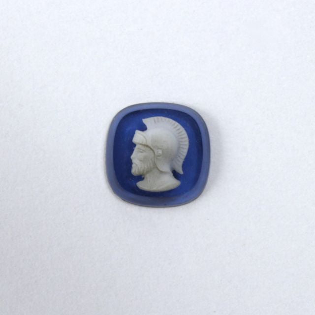 Transparent blue background with opaque white detailed profile of a Trojan warrior.