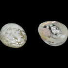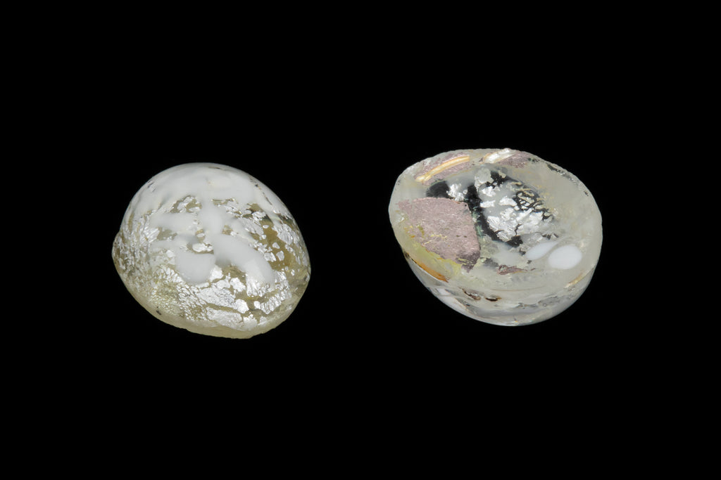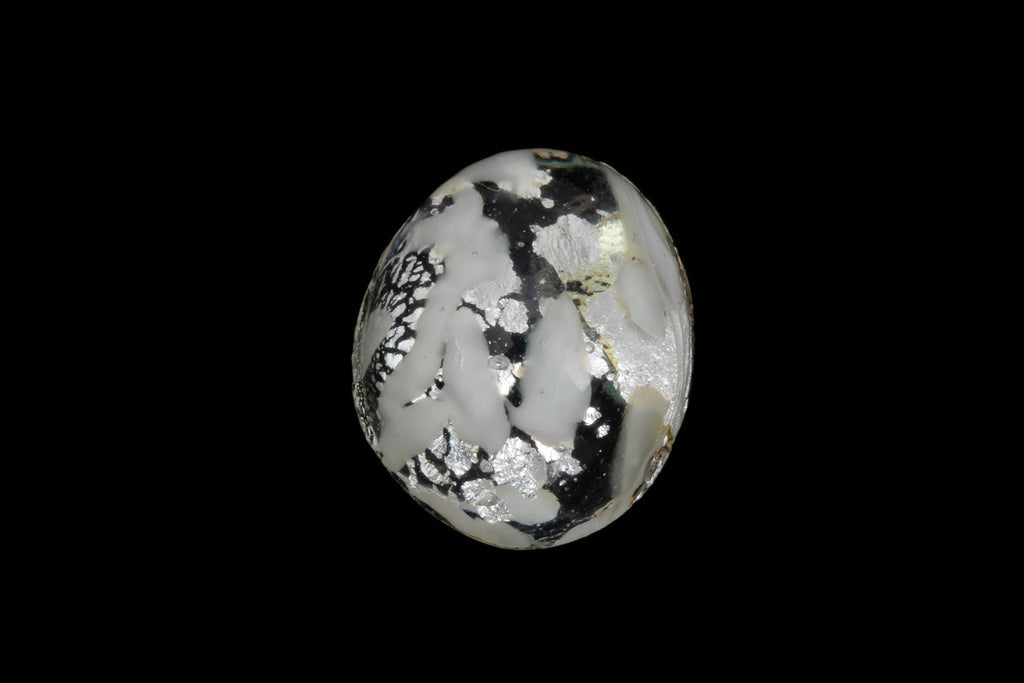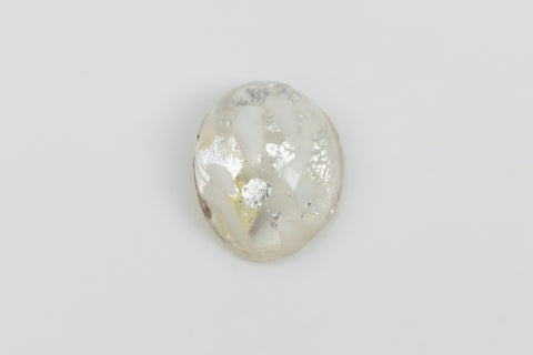 Clear with swirls of opaque white and flecks of silver foil. No two exactly alike.Made in Germany or the Czech Republic in the 1960's or earlier.Sold individually.