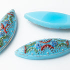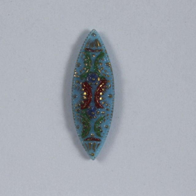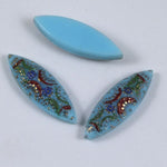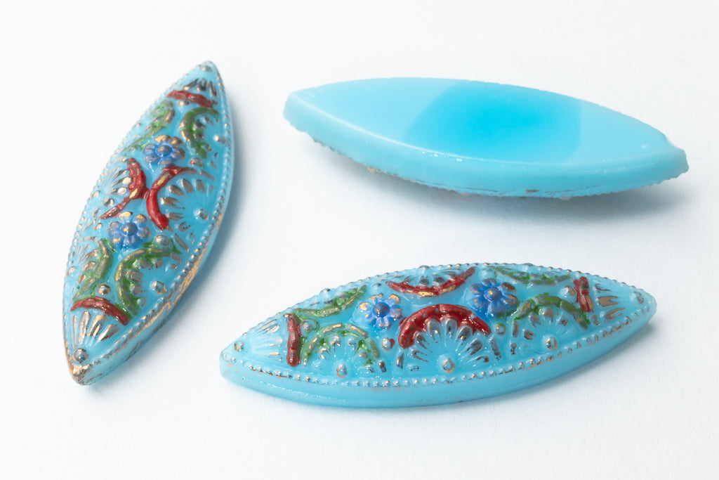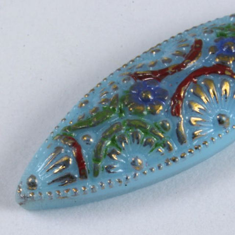 Vintage glass cabochon.8mm x 25mm flat back navette with Florentine design.Opaque light blue background with red, green, blue and gold details.Made in Germany in the 1950's.Sold individually.